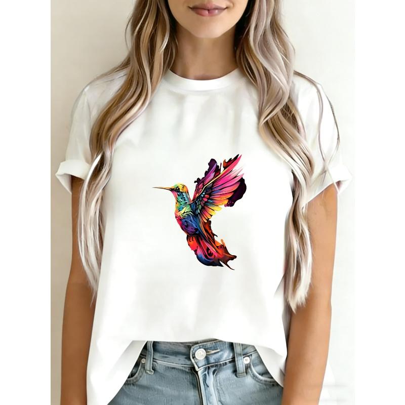 Women Casual T Shirt White Colorful Hummingbird Print Summer Fashion Top For Daily Wear And Outing
