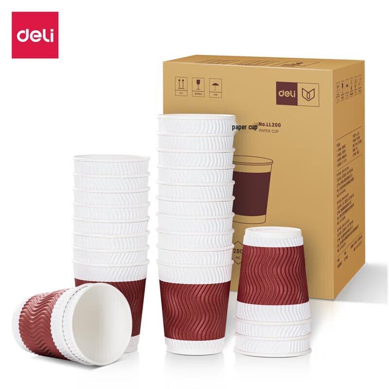 Deli 280mL double-layer disposable paper cups, ideal for both hot and cold beverages. These sturdy cups come in a vibrant red color and are conveniently packed in a box of 500, perfect for offices, events, or everyday use.