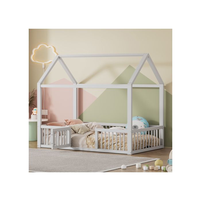 90*200cm Lit en bois massif, Lit double, Lit plat, Lit de maison, Lit de maison avec porte, blanc