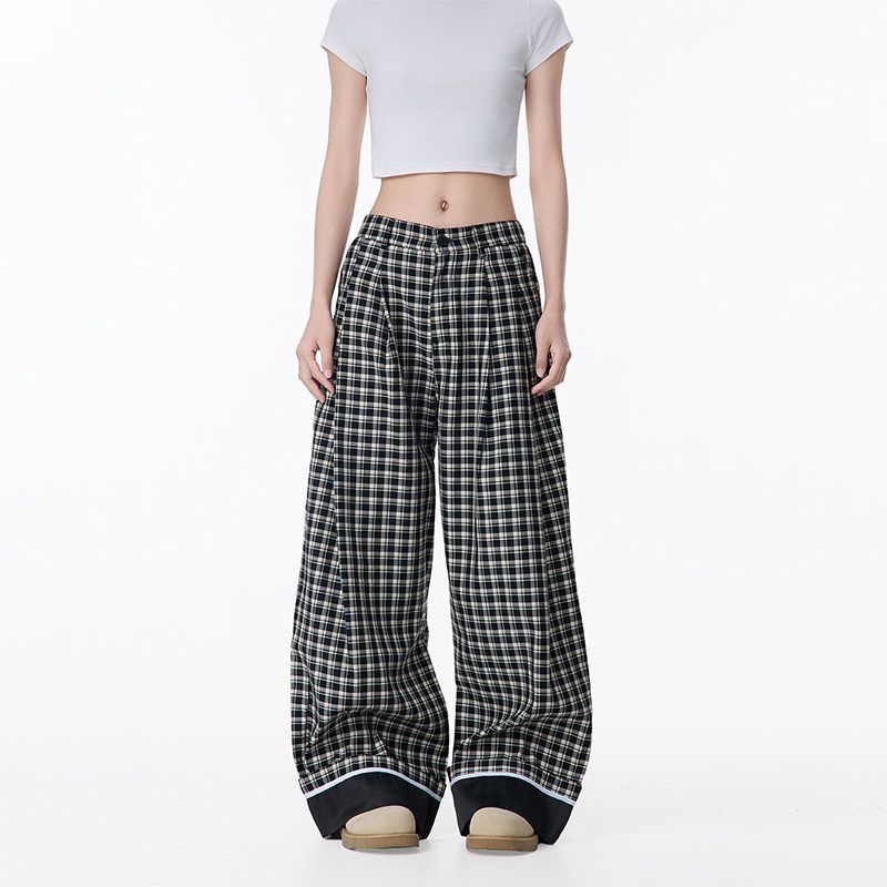 Black of Exit American Retro Plaid Cuffed Casual Pants for Men and Women, Loose and Lazy Wide-Leg Floor-Length Pants