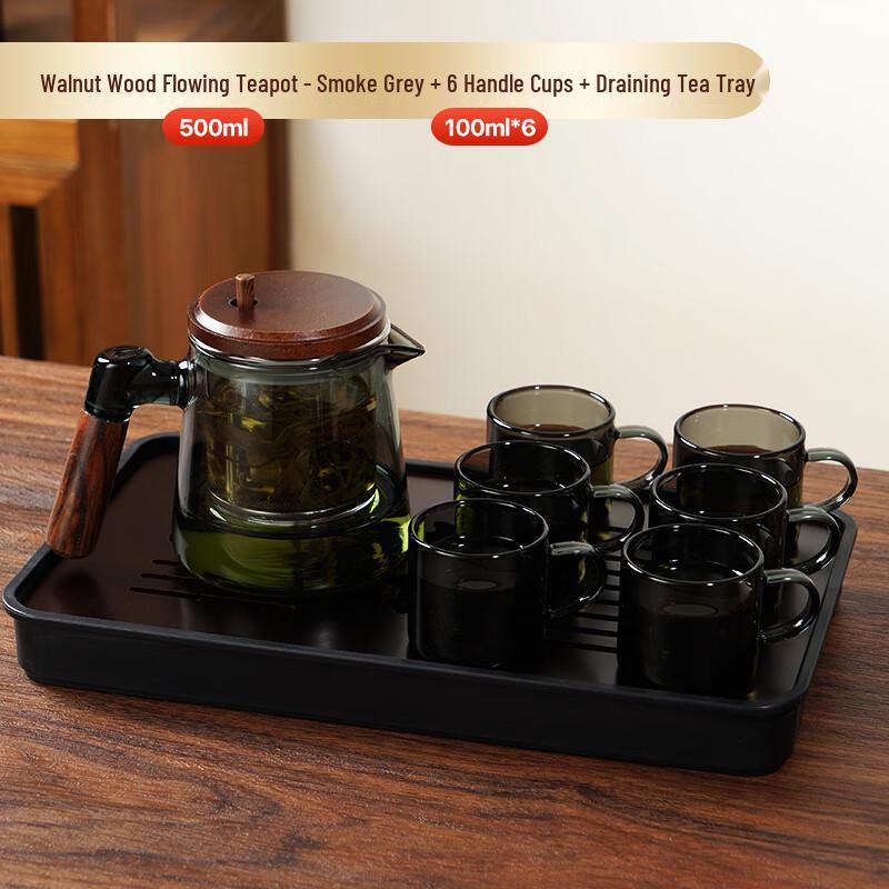 Walnut Handle Glass Teapot Set with Cups and Tray