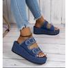 New Summer Women's Plus Size Wedge Denim Belt Buckle Slip on Chunky Sole Outdoor Slide Sandals