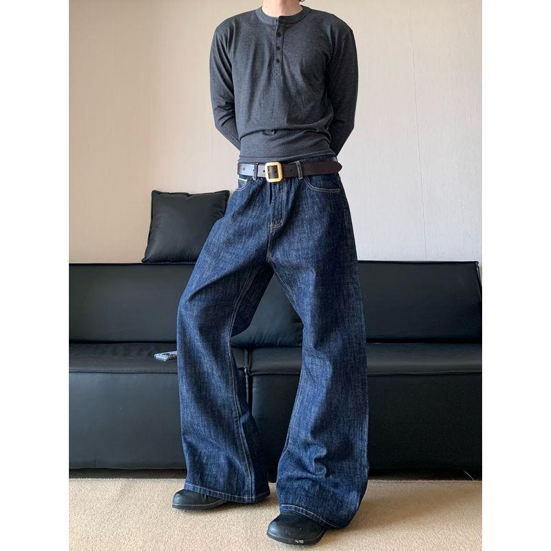 Cabbage Coke Stiff Dark Blue A-Line Slightly Curved Knife-Cut Jeans for Men and Women, Autumn Silhouette Raw Denim Wide-Leg Pants