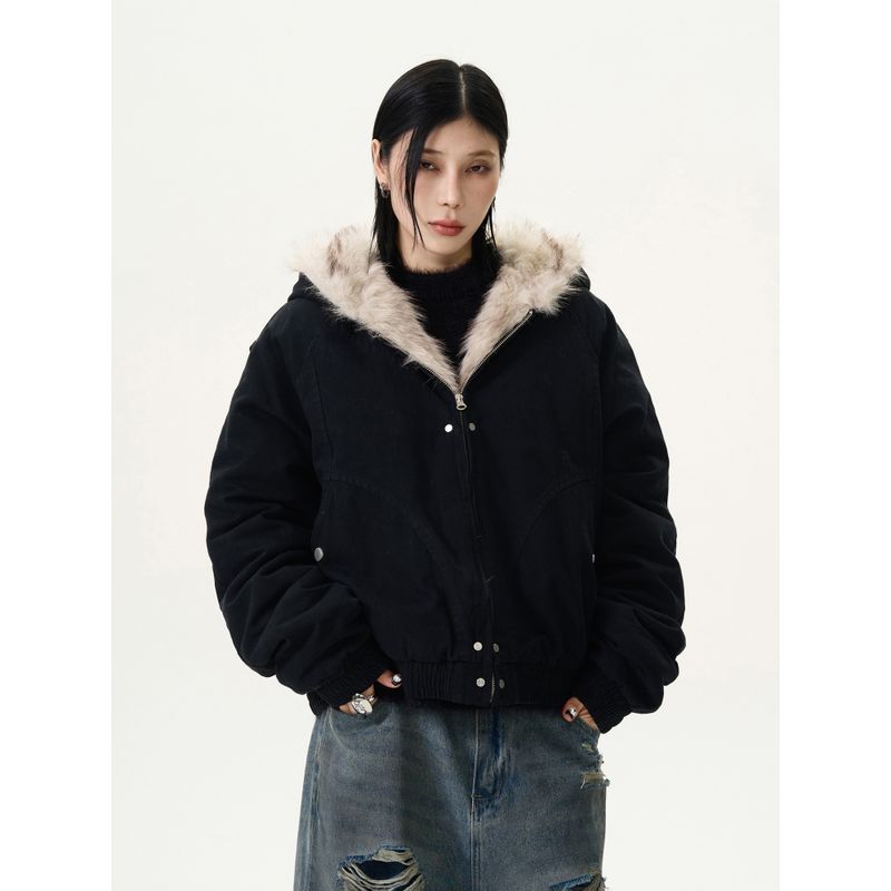 Kisko American Retro Deconstructed Silhouette Jacket with Mountain Carving, Unisex Warm Fur Collar Hooded Cotton Cardigan Coat