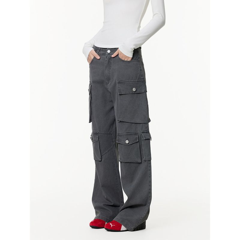 Black of Exit American Retro Distressed Multi-Pocket Straight-Leg Cargo Pants Trendy Heavy-Duty Casual Pants Vibe