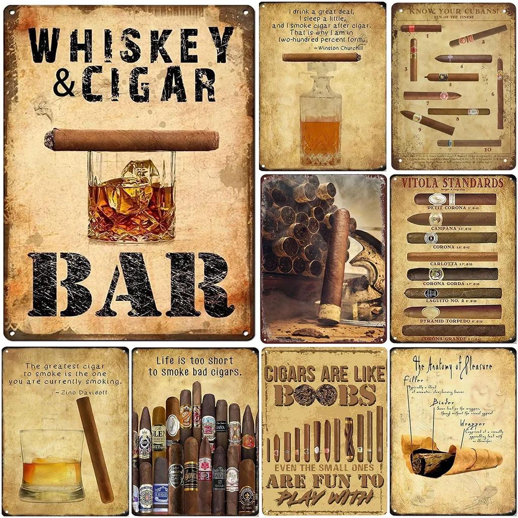 Whiskey Cigar Metal Tin Signs Plaque Wall Decoration Vintage Art Posters Iron Painting for Man Cave Home Cafe Garden Club Bar