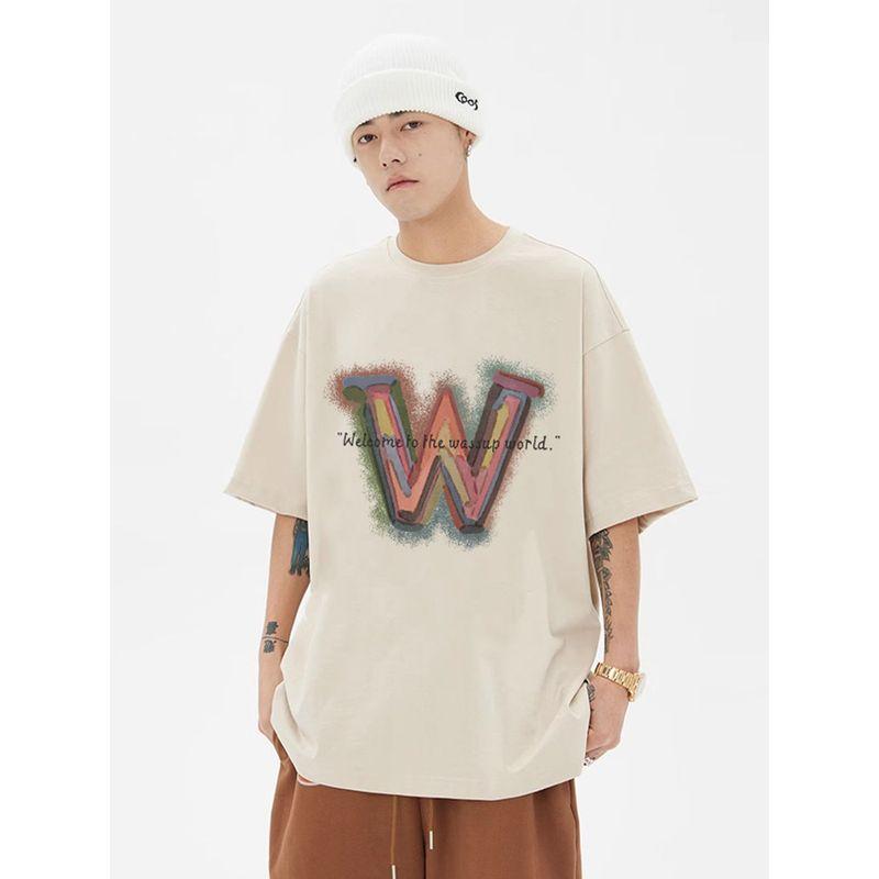 Wassup Retro Inkjet Letter T-Shirt Short-Sleeved Men's Summer Loose Casual Heavyweight Pure Cotton Couple's Round Neck Top