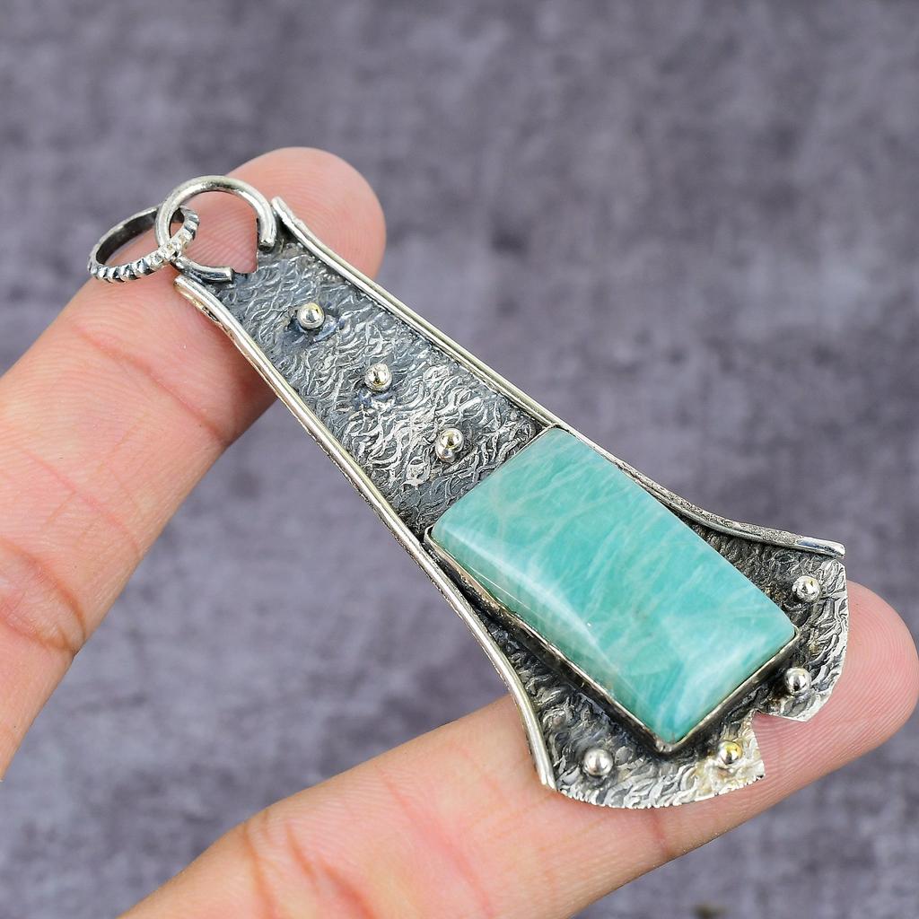 Natural Amazonite Gemstone Handmade 925 Sterling Silver Pendant 3.55" ET-1592