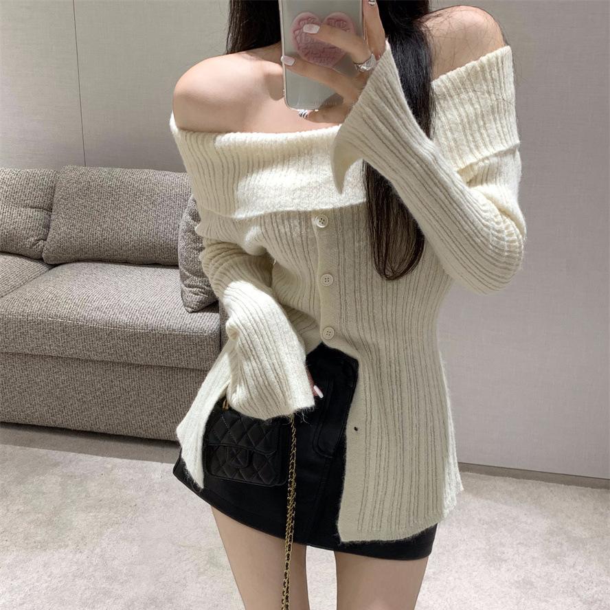 Gentle wind split apricot knitted sweater women's clothing autumn new Spice Girl niche shoulder sweater