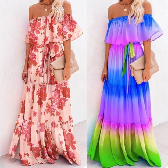 Off shoulder long dress can greatly show your sexy and charming clavicle. Floor length and flowy hem design allows this maxi dress to hide your imperfect part, and visually make you look slimmer.