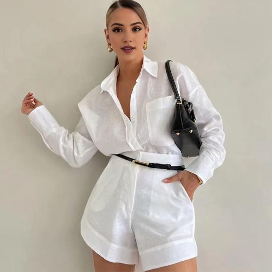 Design: Embrace casual elegance with this two-piece set featuring a shirt and casual shorts. The solid color ensemble exudes simplicity, while the lapels, long sleeves, and single-breasted buttons add a touch of sophistication. The wide-leg pants with double side pockets offer both fashion and functionality.