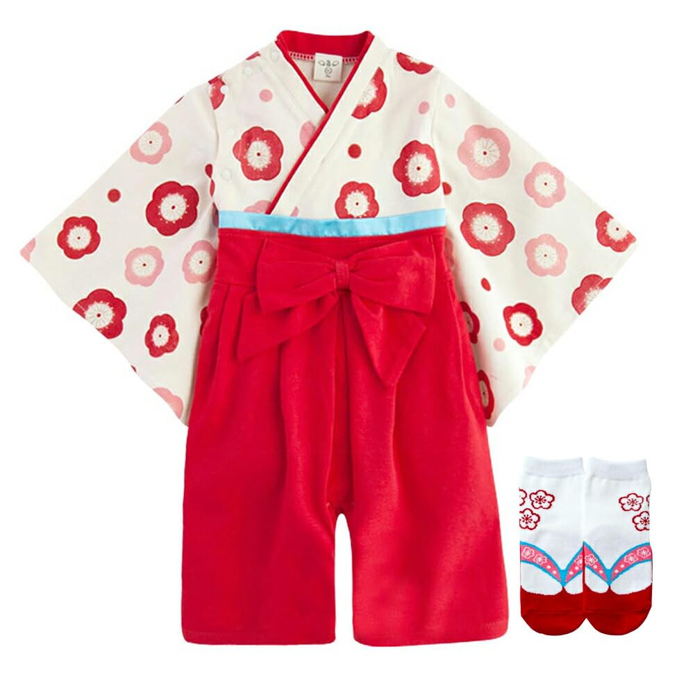 Augelute Hakama Romper and Socks Set, Front Opening, Baby Girl, Size 60, Red