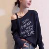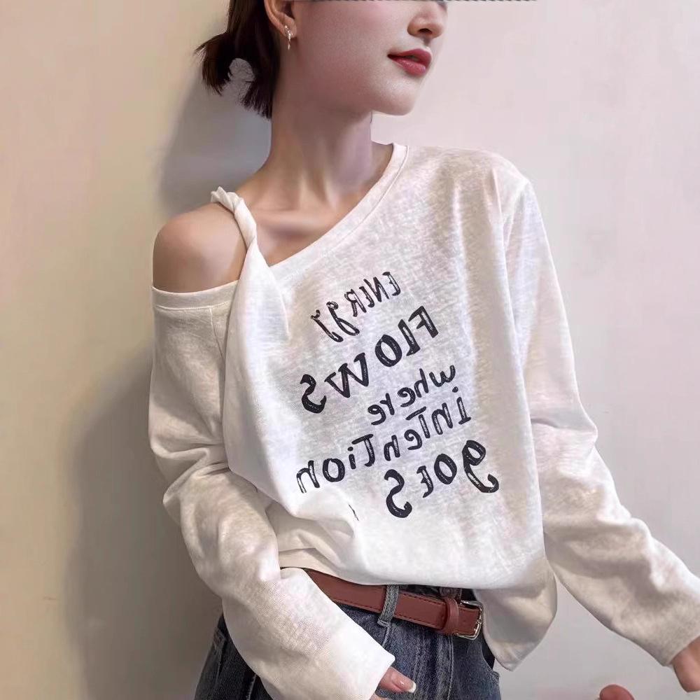 [Lazy cotton 65 cotton 35 polyester] Slant neck off-the-shoulder letter printed T-shirt loose and versatile long-sleeved autumn bottoming shirt