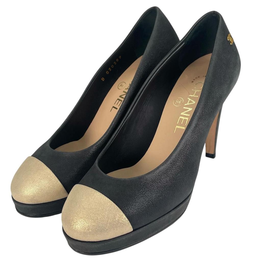 Great CHANEL pumps COCO Mark round toe Black beige leather Women 35 G30389 Used