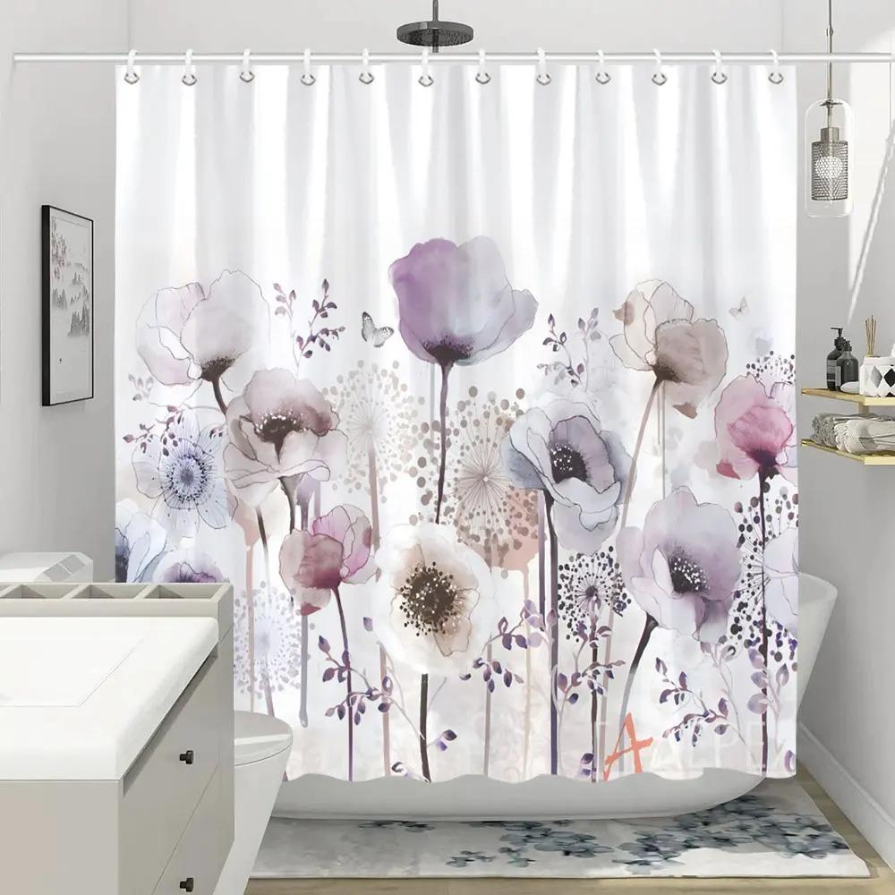 Colorful Flowers Shower Curtain for Bathroom Pink Floral Romantic Wildflower Plants Nature Scenery Decor Curtain Set with Hook