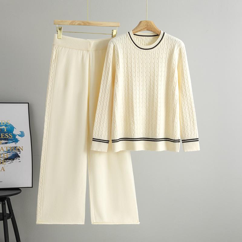 A New Autumn and Winter Fashion Set for Women, Featuring A Round-neck Knitted Sweater with A Loose and Elegant Base Layer and Wide-leg Pants