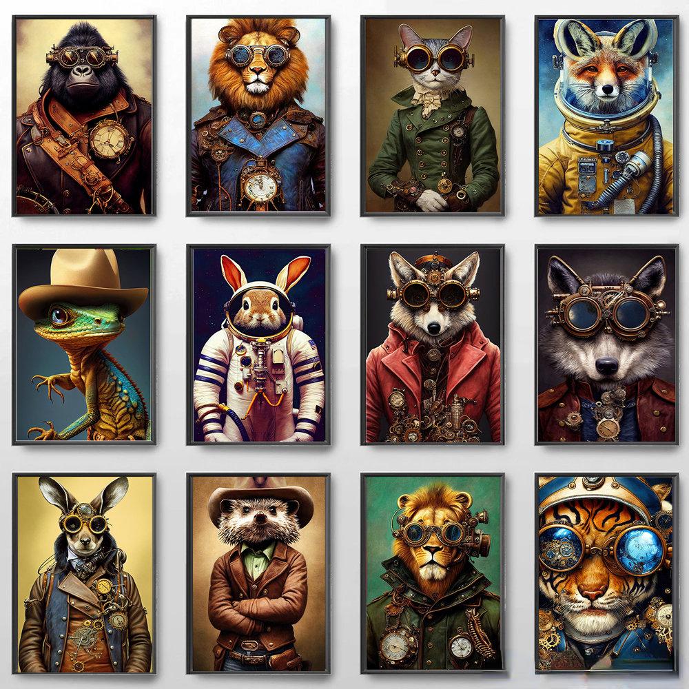 Steampunk Cat Wolf Astronaut Rabbit Poster Art Canvas Painting Retro Funny Animal Tiger Gorilla Poster Living Room Home Decor