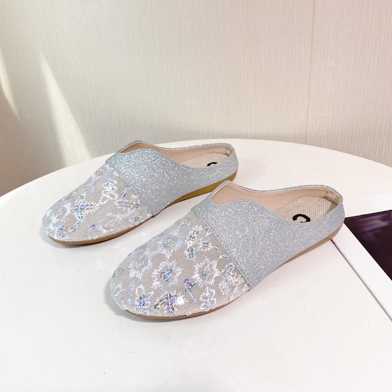 Fashion Spring New Baotou Slippers Women's Fashion Round Head Deep Mouth Splicing Sequin Cloth Soft Soled Non-slip Flat Shoes