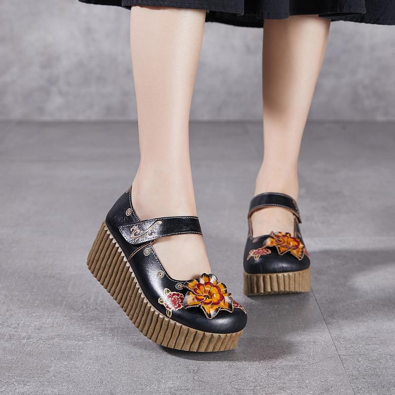Fashion GKTINOO Retro Pumps Women Shoes Genuine Leather Hook & Loop 2025 New Spring Round Toe Floral Handmade Concise Platform Shoes