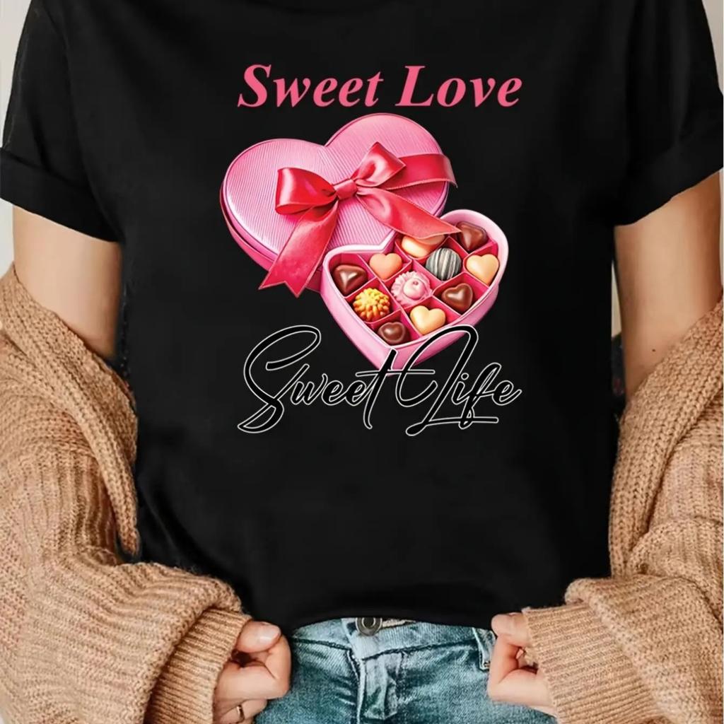 1pc Women's Casual T-Shirt with Sweet Love Heart & Chocolate Gift Box Print, Short Sleeve, Round Neck, Breathable Knit Fabric, L
