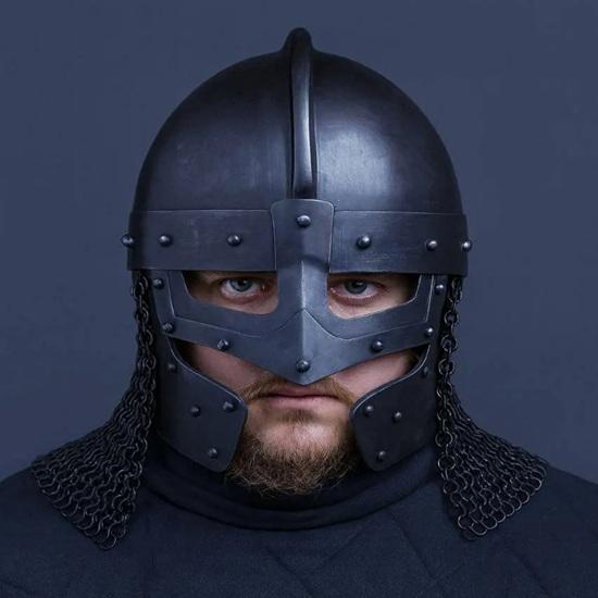 This Medieval Spangen helm Raven Helmet features a classic segmented steel skullcap construction, reinforced for strength and authenticity. The helmet is fitted with a beak-shaped face guard, inspired by raven symbolism often associated with wisdom, war, and mythic warriors. A chainmail aventail hangs from the lower edge, protecting the neck and shoulders while enhancing historical accuracy.