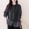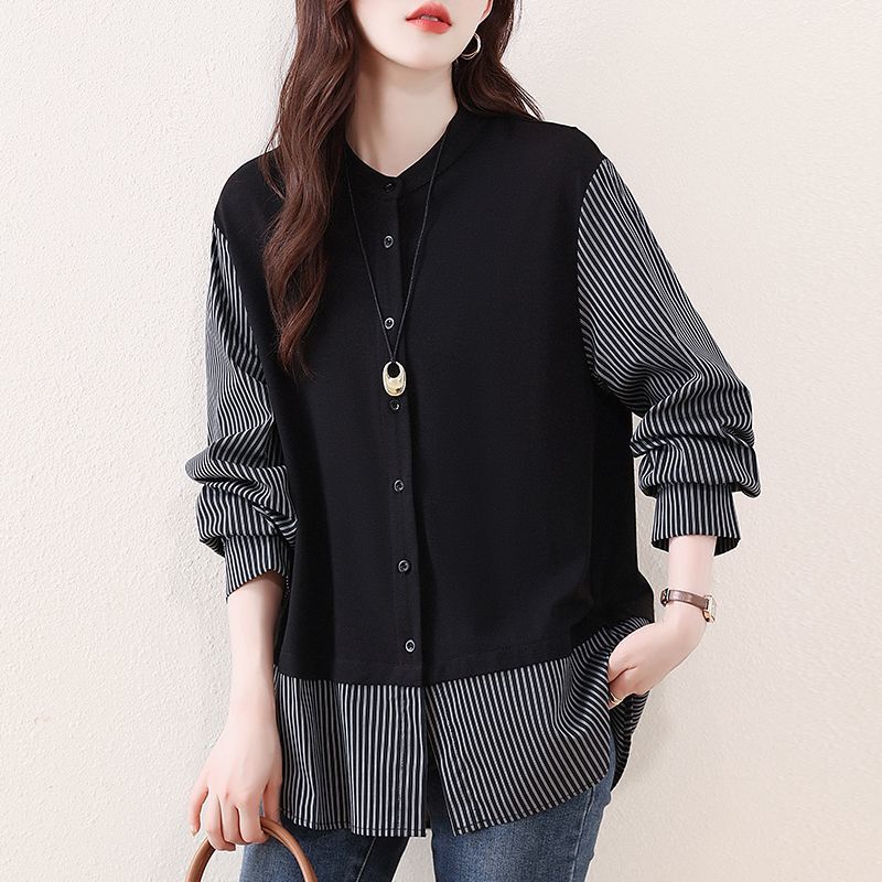 Fashion High-end Striped Stitching Fake Two-piece Shirt for Women Autumn New Style Loose Cardigan Top