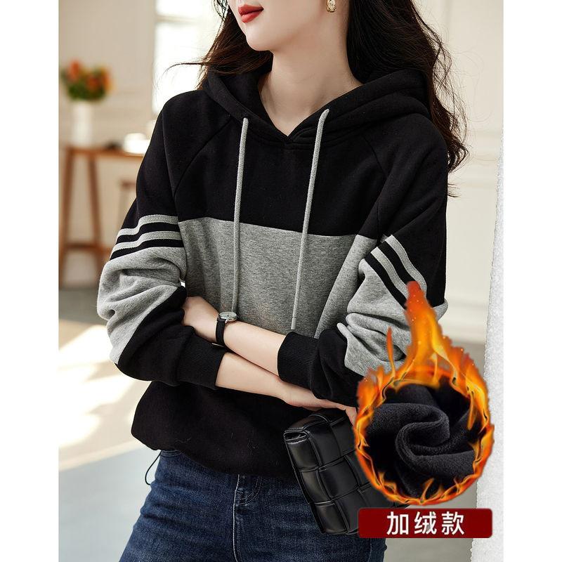 Autumn Winter Striped Patchwork Hooded Sweatshirt for Women Korean Style Ins Loose Western Style Casual Pullover Top