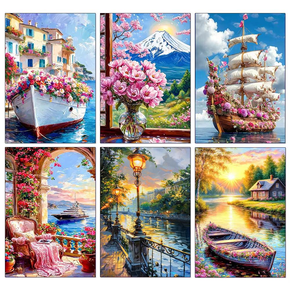 Sea Sailboat 5D Diamond Painting Kit Mountain View Flower House Mosaic Cross Stitch DIY Home Decor Gift for Adult Beginners