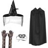 Elevating your Halloween cosplay costume with the Witch Cloak Costume comes with Witch Hat Lace Eye Mask and Long Gloves, featuring unique half veil that adds touch of mystery at any cosplay event.