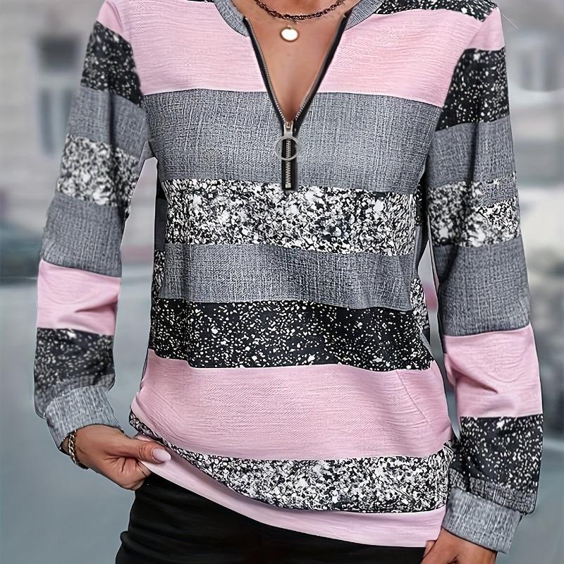 Women's Casual Striped Knit Sweatshirt with Zipper Detail, 100% Polyester Crew Neck Pullover for Spring, Summer, and Fall