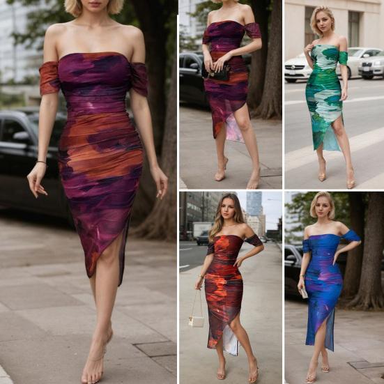 Women's Strapless Ruched Bodycon Midi Dress Off Shoulder Short Sleeve Cocktail Party Dress Printed Backless Slit Club Dress
