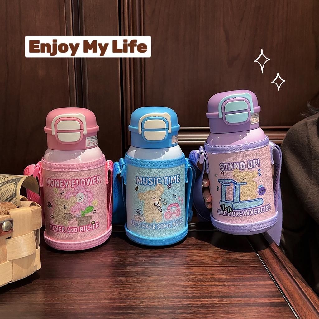 Cartoon cute children's thermos cup with cup cover anti-drop straw water cup vacuum student strap cup exquisite gift