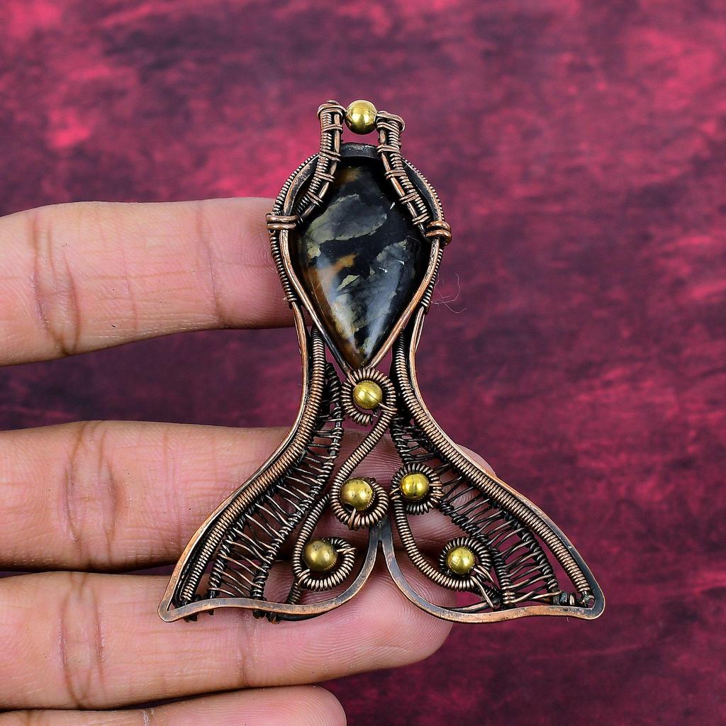 Picasso Jasper Gemstone Pendant Handmade Copper Wire Wrapped Jewelry Fish Pendant