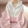 Pink and white splicing with hooded knitted cardigan sweater women's new seasonal Korean atmosphere top