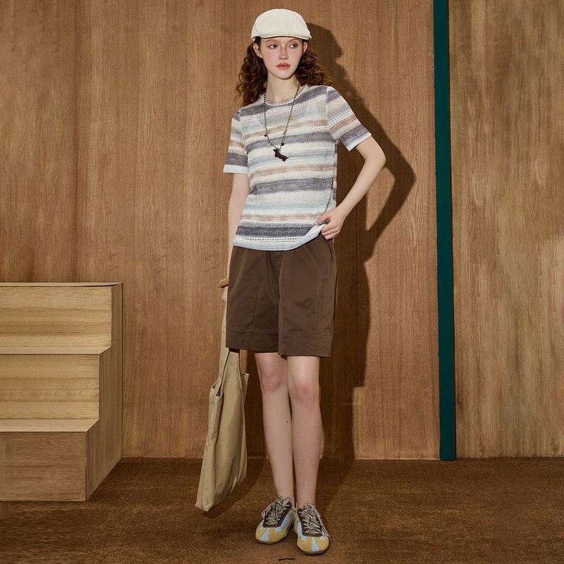 Coolhut Color-Blocked Striped Slim-Fit Knit Short-Sleeve Round-Neck Lightweight Versatile Casual Simple 2025 Summer Women's T-Shirt