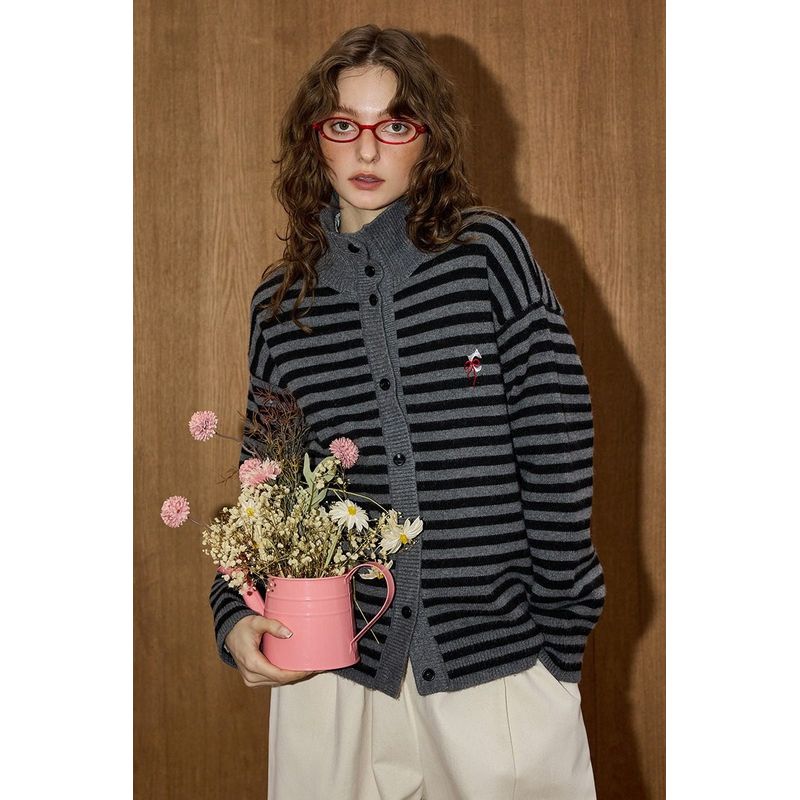 Coolhut Gray American Retro New Style Women's Loose and Versatile Stripesd Knitted Cardigan
