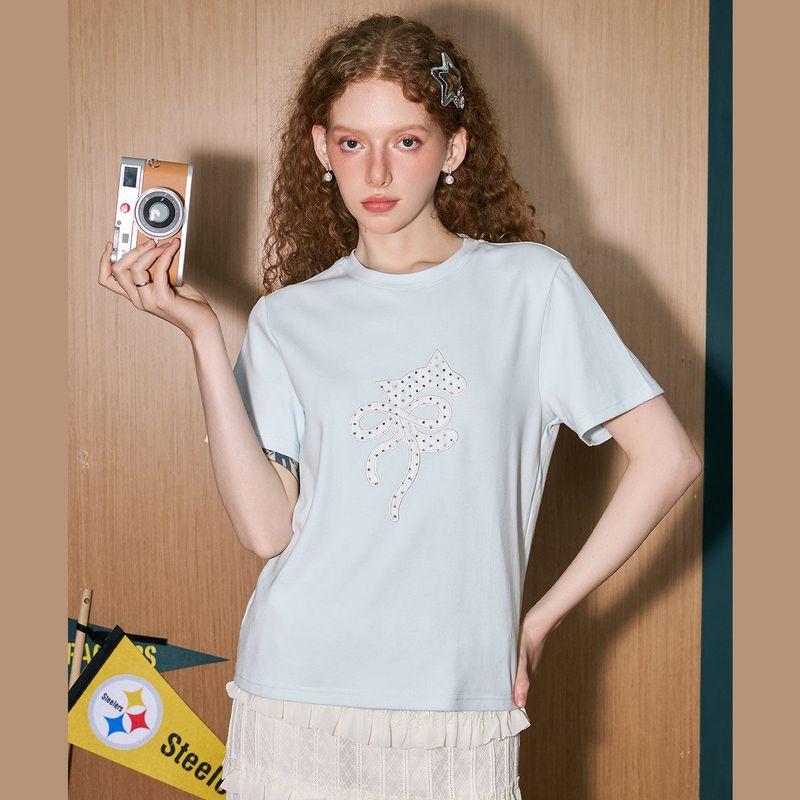 Coolhut2025 Summer Sweet Bow Embroidery Loose Slimming Versatile Women's T-Shirt