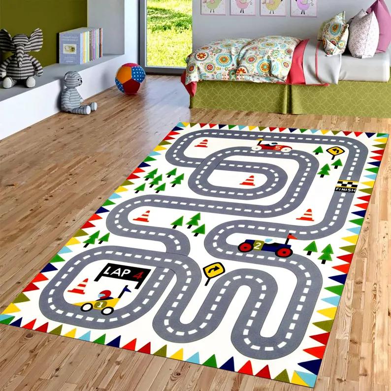Dětský koberec s motivem silnice a dráhy na hraní, měkký sametový, dětská domácí dekorace, protiskluzový, pratelný, domácí dekorace, retro koberec