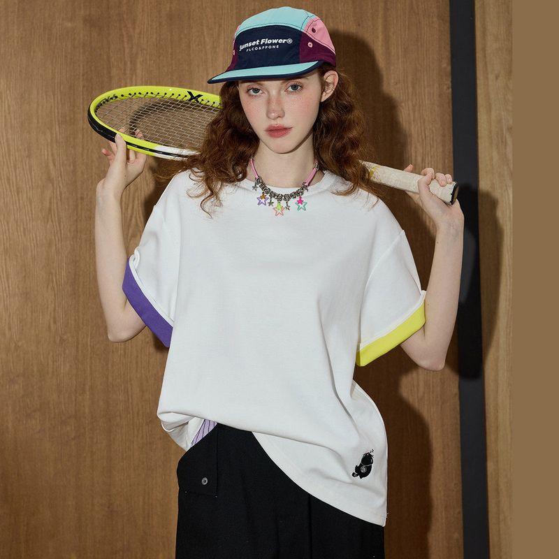 Coolhut Color-Blocked Loose Design Embroidered Top 2025 Women's T-Shirt Short-Sleeved Loose Round Neck Drop Shoulder