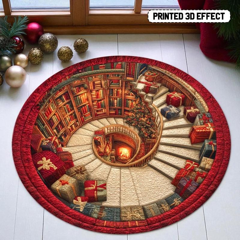 3D Book Library Christmas Carpet Printed Round Rug with Gifts and Tree Festive Holiday Flooring Mat for Home Christmas Holiday