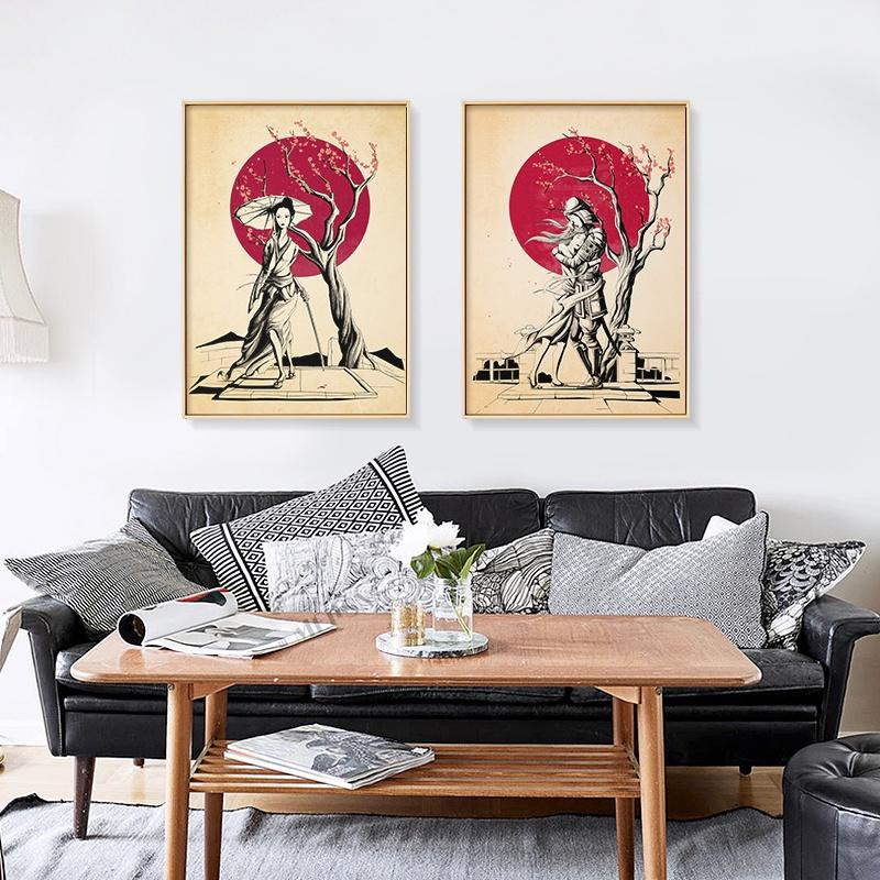 Japanese Ink Canvas Art Print Poster Samurai Couple Cherry Tree Wall Art Paintings for Living Room Decoration Home Decor