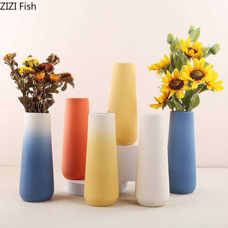 Colorful Gradient Ceramic Vase Cylinder Flower Pots Desk Decoration Flower Arrangement Modern Floral Vases Room Aesthetic Decor