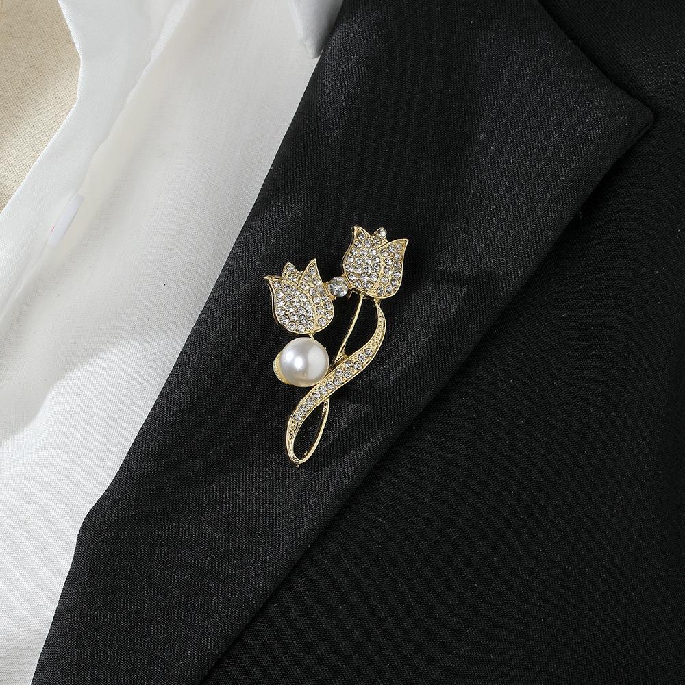Diamond Temperament Tulip Pearl Brooch, Light Luxury High-End Coat Corsage Suit Pin Women