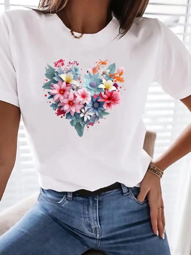 (Asian Size) love heart flower cute Print Female Clothing T Shirt Women Fashion Tee Top Woman Short Sleeve Graphic T-shirts
