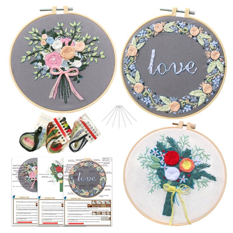 3pcs Cotton And Linen Floral Embroidery Kit Diy Material Package 20cm Bamboo Embroidery Hoop
