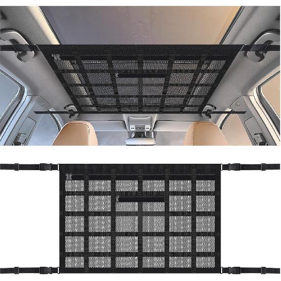 🛒 Large Capacity Car Storage: The cargo net storage has a large mesh bag and a small mesh bag designed to store not only large items such as children's quilts, toys and clothes, but also small items such as coins, bank cards, keys, small wallets, etc. The cargo net on the roof of your SUV is fixed above your head and within reach, so you never have to look for it in the trunk again
