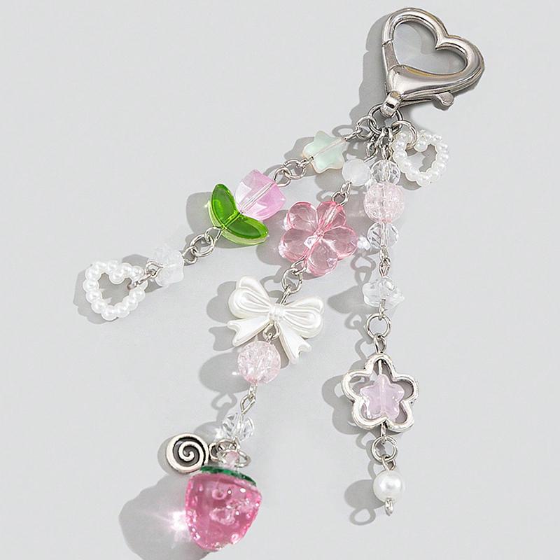 Imitation Pearl Bow Heart Pendant Bag Pendant Pink Strawberry Hollow Flower Tulip Beaded Keychain Accessories