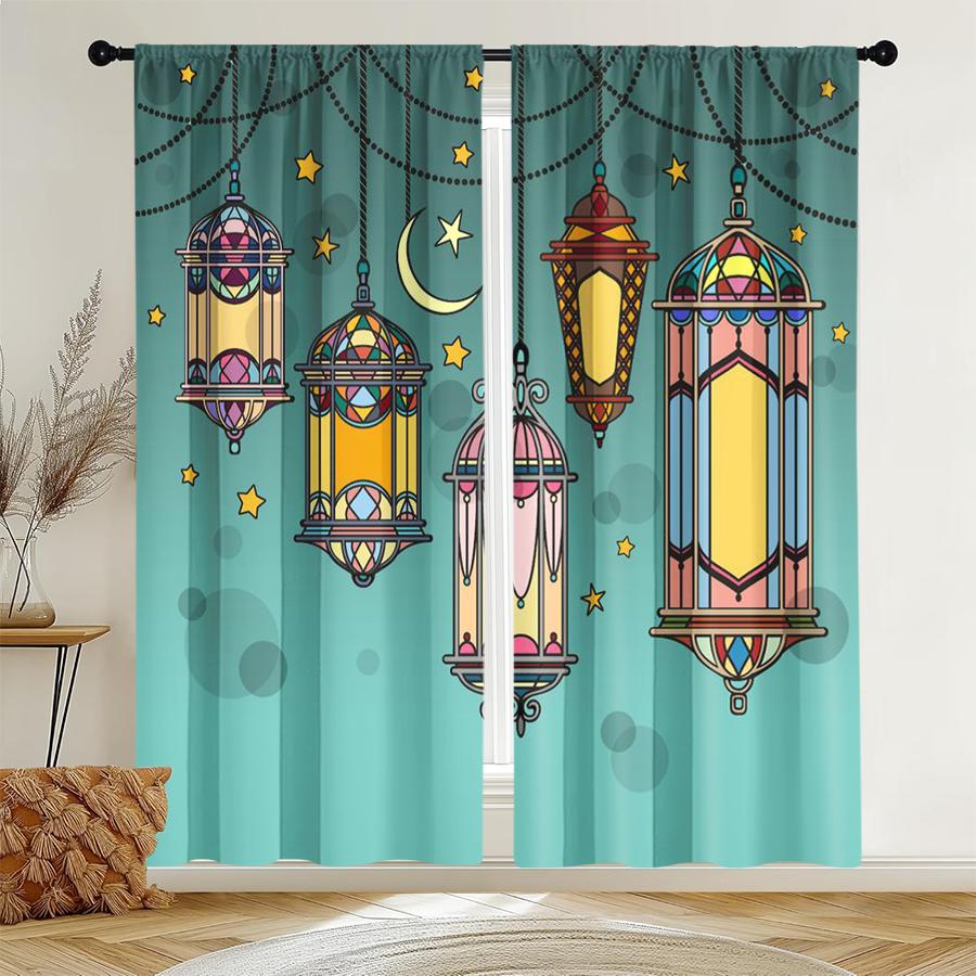 2 ks Tyrkysové vitrážové lucerny a závěsy s potiskem půlměsíce a hvězdy, Ideální pro výzdobu oken na Ramadan/Eid, Závěsy s kapsou na tyč