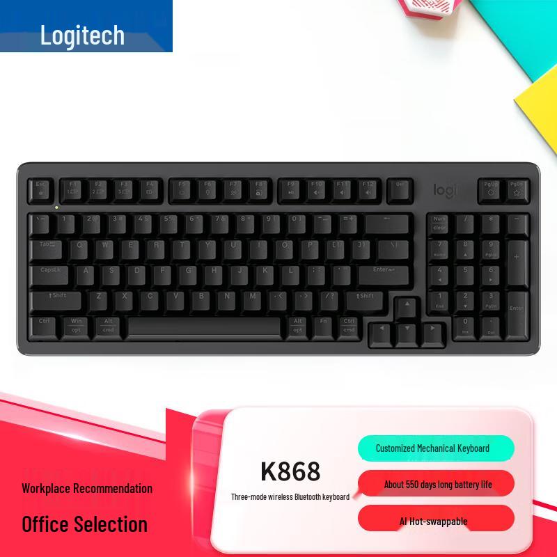 The Logitech K868 Tri-Mode Custom Mechanical Keyboard offers unparalleled versatility and personalization. Connect seamlessly via wired, 2.4GHz wireless, or Bluetooth, supporting up to three devices simultaneously. Its full-key hot-swappable design empowers you to easily change switches to match your preference. Enjoy extended use with an impressive 550-day battery life and choose from 6 dynamic backlight modes. Crafted with durable ABS materials, this keyboard is compatible with multiple operating systems, making it ideal for both productivity and gaming.