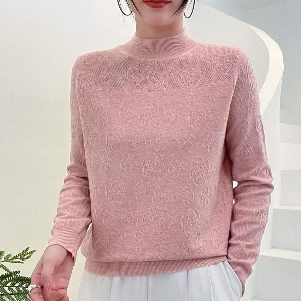 Autumn Winter Women's Lace Half-Turtleneck Sweater Loose Carved Knit Pullover Sweater Solid Color Knit Top